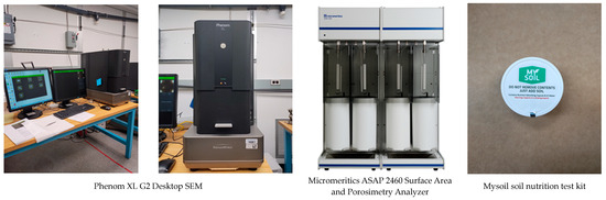Scanning electron microscopy–energy dispersive X-ray spectroscopy (SEM-EDS) (Thermo Scientific, Boston, MA, USA, Phenom XL G2, Serial No. MVE031342-0124-L) was used to obtain a high-resolution image and analyze the biochar morphology and elemental compositions. This unit has a large chamber and sample stage (100 × 100 mm2). Morphology and elemental analysis were performed with assistance from lab technicians in the Department of Civil and Environmental Engineering at Morgan State University. Surface area and porosity are important physical properties of biochar, playing a crucial role in many biochar applications. The Brunauer–Emmett–Teller (BET) method is a physical characterization technique that provides quantitative data on the specific surface area and porosity distribution of solid materials [37]. The BET analysis was conducted by MSE Supplies LLC (Tucson, AZ, USA) using a surface area and porosimetry analyzer (Micromeritics, Norcross, GA, USA; ASAP 2460) in adherence with the ISO 9277 [38] standard to evaluate pore size (at both meso- and micro-pores), specific surface area, and pore volume (Figure 2).