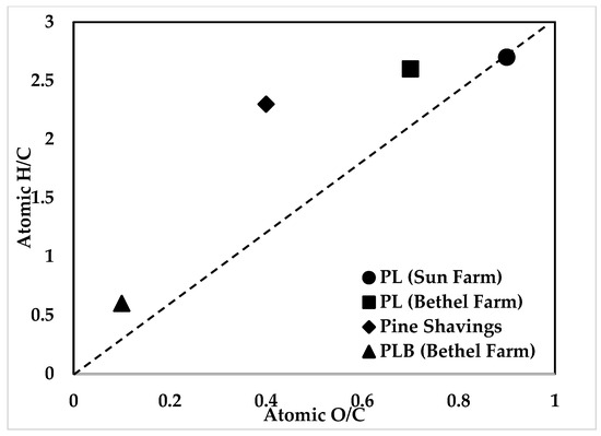 The molar H/C ratio is a material property that is correlated with the stability of the material, while a H:Corg below 0.7 is referred to as thermochemically converted; this criterion is used to distinguish biochar from biomass that has not been fully thermochemically altered [39]. Biochar materials have a greater proportion of fused aromatic ring structures [45]. As shown in Figure 3, a van Krevelen diagram was plotted to show the degree of aromaticity and carbonation in both raw biomass and PLB samples. Atomic H/C and O/C ratios are indexes of aromaticity and carbonization of biochars. The H/C and O/C ratios in PLB were lower than those in their respective raw materials due to dehydration, decarboxylation, and decarbonylation [46]. The results indicate that the H/C ratios decreased more significantly than the O/C ratios, resulting from dehydrogenation and demethylation [47]. As seen in the van Krevelen diagram, lower O/C and H/C ratios were associated with higher heating values (HHV) of biochar [48]. The pyrolysis process also reduced the oxygen content and increased the carbon percentage of the sample. The resulting PLB had a higher HHV value than two PL samples (14,596 Kj/kg vs. 13,782 Kj/kg and 13,698 Kj/kg) despite its high ash content (52.42% vs. 26.63% and 33.00%). The resulting PLB is also ideal for use as a fuel due to its higher HHV.