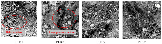 Change in macro-pores, mesopores, and micropores in PLB 1, PLB 2, PLB 5, and PLB 6.