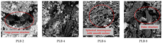 Figure 4 shows the SEM images of the prepared PLB samples under the various conditions at two pyrolysis temperatures. The PLB 1, 3, 5, and 7 samples underwent pyrolysis at 300 °C, while the PLB 2, 4, 6, and 8 samples underwent pyrolysis at 500 °C. The large porous structures were readily visible in all the PLB samples. As shown in the highlighted red areas, the flake structure of graphite can be observed clearly in sample PLB 1 and PLB 8. The results indicate that increasing the pyrolysis temperature (500 °C) favored the pore opening. This finding shows the pyrolysis temperature had a notable impact on the pore structure and morphology of biomass char. Previous studies found the removal of volatile matter produced pore openings from 200 °C to 500 °C. Structural shrinkage and pore narrowing occurred when the surface area reached a maximum value at 500 °C [49]. Furthermore, the macrospores possessed a nearly spherical shape (in the PLB 6 image). This may be the result of the softening and melting effect caused by local high temperatures. High temperatures led to plastic deformation of particles and resulted in smooth surfaces (in the PLB 6 image) and large cavities (in the PLB 2 and 3 images). After devolatilization at 500 °C, the morphology of the particles changed and an ordered structure was observed. PLB with a high surface area has an adsorption capacity that makes it suitable as a remediation agent for removing heavy metals.