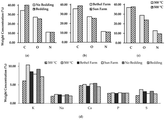Figure 5a,d confirms the addition of PS as bedding material in the PL feedstock can increase the carbon content and reduce the oxygen content of the PLB, since PS had a higher carbon and lower oxygen level, as shown in Table 1. The content of N and P changed slightly with the addition of PS. The content of S and some other inorganic compounds such as K, Na, and Ca decreased since PS was not the significant source of these elements. Figure 5b,d shows that the element compositions of PLB from different farms were very similar. The pyrolysis process can reduce the oxygen content and increase the carbon percentage of the sample, and a high pyrolysis temperature was favorable for this transaction. This trend is clearly shown in Figure 5c. The content of N was observed to be reduced due to the high pyrolysis temperature. Other element compositions increased, as shown in Figure 5d. The removal of volatile matter at a high pyrolysis temperature may effectively condense the inorganic elements in the PLBs.