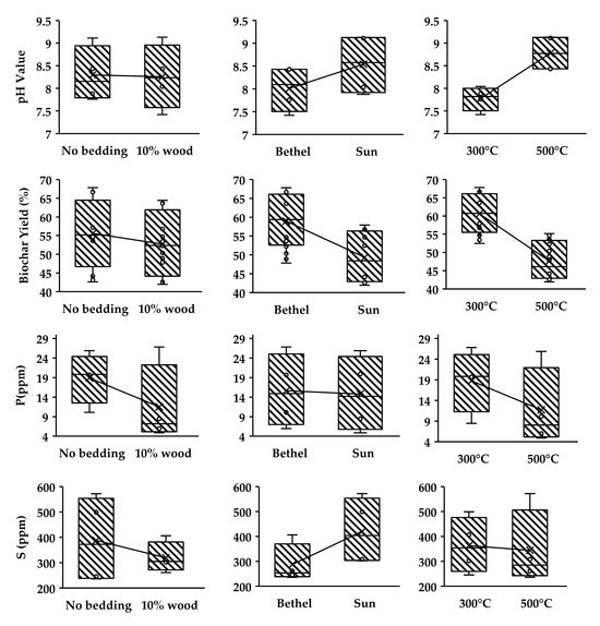 As shown in Figure 6, the effect of bedding material mixture (10% PS), PL source, and pyrolysis temperature on the pH value, PLB yield, and extractable nutrients of phosphorus and sulfur were investigated using a box-and-whisker plot. The results indicate that the addition of PS bedding material could potentially reduce the biochar yield. This can be explained by the feedstock compositions. According to the proximate and ultimate analysis (in Table 2), PS had higher VM (69.60% vs. 65.31 and 57.94%) and lower ash content (22.39% vs. 26.63 and 33.00%) than PL. Previous studies found that PS with a high VM portion was easy to decompose, which ultimately decreased the biochar yield during pyrolysis [25,26,50]. The addition of PS as bedding material could also potentially reduce extractable nutrients level of P and S as well because manure-based biochar usually has a lower surface area than biomass biochar. The reason is that larger pores present in PLB produce a small surface area compared to smaller pores in PS biochar [51]. The high surface area of PS within PLBs efficiently absorbed and reduced the P and S levels [51,52,53]. It can be also seen that PL collected from the Bethel Farm had about 10% higher PLB yield compared to the one from Sun Farm because of the high ash content of the PL feedstock from Bethel Farm (33% vs. 26.63%). Meanwhile, the difference of extractable P was very small, and the extractable S was significantly reduced (32%) when using PL from Bethel Farm to produce PLB because the original S content of Bethel Farm (1.43%) was smaller than that of Sun Farm (1.72%). This study also found that pyrolysis temperature plays a key role in changing the extractable phosphorus, sulfur, and PLB yield. PLB yield was reduced by 13% when the pyrolysis temperature increased from 300 °C to 500 °C, which is consistent with previous studies [26,27]. Meanwhile, a higher pyrolysis temperature can reduce the extractable P by 37% because the high temperature may help to transform labile P in raw PL into non-labile P in PLB. The pH test results found that the soil and PL from Sun Farm was slightly acidic and that the PLB samples were alkaline (pH 7.42–pH 9.13), which suggests that PLB can be selected as a liming agent. In addition, the pH value increased with the increased pyrolysis temperature, while adding PS as a bedding material had a minor influence on the pH level of the samples. Based on the results, the PL from Sun Farm, with a high pyrolysis temperature, will be suggested while using PLB as a liming agent. For further control of the surface runoff of P, adding bedding material and using a pyrolysis temperature of 500 °C is suggested.