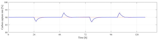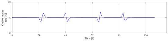 The results comparatively show the control system performance for the two considered scenarios of the constrained and unconstrained carbon capture MPC-controlled variables. The CO2 capture rate (controlled variable), the molar ratio (manipulated variable), the liquid phase temperature in the reboiler (controlled variable), and the energy performance index are presented in Figure 3 and Figure 4.