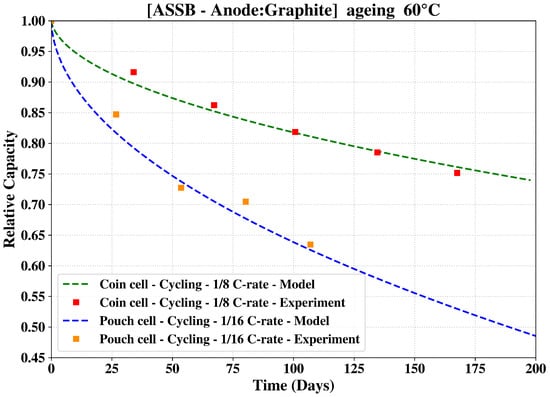 The relative capacity over a duration of 200 days at 60 °C for the coin cell (cycling at 1/8 C-rate) and the pouch cell (1/16 C-rate). The experimental data are from Kobayashi et al. [34].