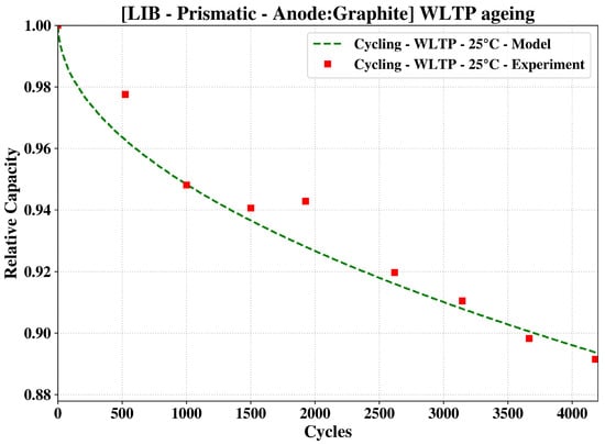 The relative capacity over a duration of 4184 WLTP cycles at 25 °C for a LIB-NMC-LMO-Prismatic battery. The experimental data are from Micari et al. [38].