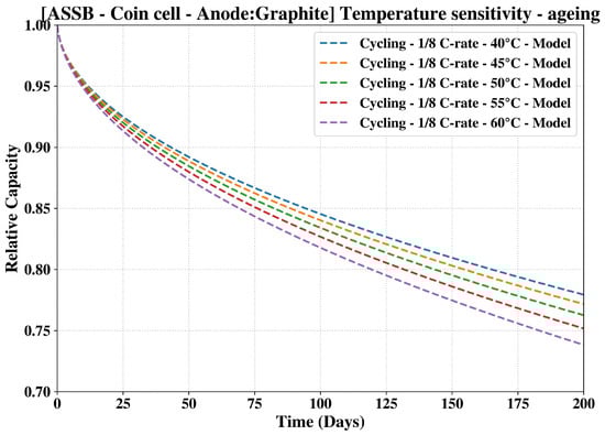 First, the ASSB cycling capabilities were analyzed for various temperature levels. The battery performance was evaluated within a range limited by the available experimental data. Specifically, the effect of temperature in the range of [40 °C, 60 °C] on the ageing of a battery cycling at C rate has been evaluated, and the results are summarized in Figure 5.