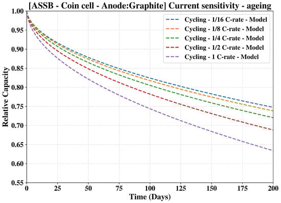 Current sensitivity analysis: relative capacity over a duration of 200 days at 60 °C.