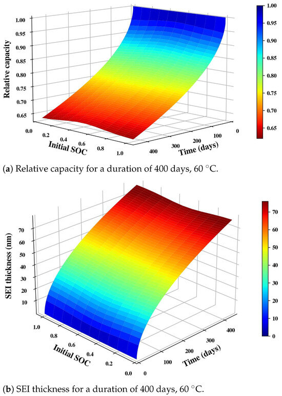 We also investigated the growth of an SEI layer that grows rapidly in the battery. As shown in Figure 7b, in the ASSB coin cell, the maximum layer thickness was 79 nm at the extremes of the SOC window. At 50% SOC, the SEI layer thickness is about 75 nm. This lack of variation in the thickness is consistent with the findings of Kobayashi et al. [34], who stated that unlike the liquid electrolyte systems, the SEI formation occurs over a wider voltage region in the SPE systems. Note that the SEI formation process is more evident in an ASSB because of the high difference in reactivity between the SPE and the graphite anode [34]. In Figure 7a, the relative capacity has been calculated as a function of time and initial state of charge (SOC). Due to the limited experimental data, it is not possible to compare different initial SOCs directly or to confirm the impact of initial SOC variations on battery ageing. However, for an initial SOC of 50%, the trend aligns well with the experimental data, achieving an accuracy of over 98%. Conversely, Figure 7b illustrates the SEI thickness over time. Unfortunately, experimental tests on battery systems do not report SEI thickness, making direct comparisons difficult. In the model, SEI thickness is directly correlated with capacity fade and is a primary factor in capacity retention. Given the high accuracy of capacity retention results relative to the experimental data, the SEI thickness results generated by this model can be considered reliable.