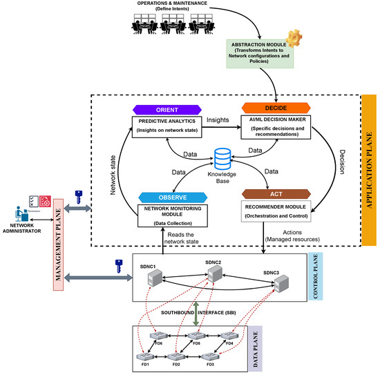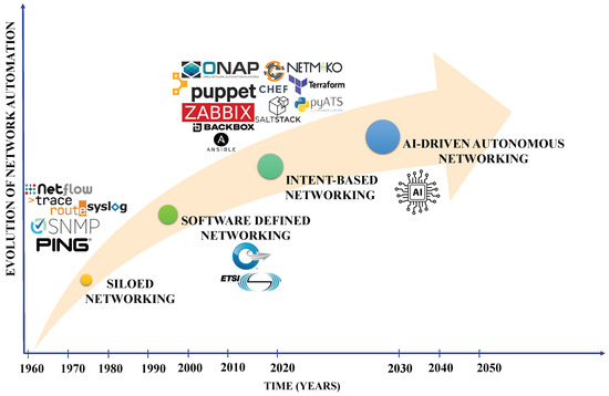 Over the years, communication networks have significantly improved, adopting new network and service management strategies. Figure 1 shows the evolution of network automation for network and service management from 1960, the launch year of the first network, to 2050. Conventional communication networks have a distributed architecture where each device is managed separately in a concept known as “siloed networking”. However, configuring, managing, and troubleshooting have become increasingly challenging as communication networks expand. To address these challenges, researchers continue to explore the concept of software-defined networking, where the control plane of the network is decoupled from the data plane [17,18]. This transforms conventional communication networks into programmable, software-defined, and centrally managed architectures, improving network management and agility, streamlining the deployment of new services, and reducing reliance on vendors [19,20]. These technologies enable more efficient data traffic routing, improved system scalability, and greater flexibility in responding to dynamic network demands, all while potentially lowering operational costs and simplifying maintenance procedures [21].