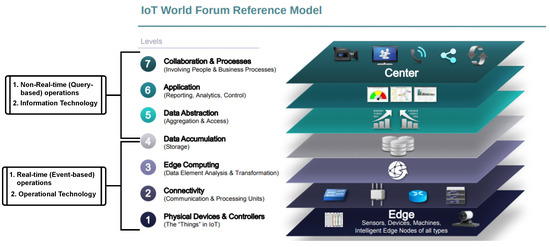 An IIoT system comprises IIoT devices, a communication network, and cloud storage servers (with advanced computation capabilities). Figure 2 illustrates the seven-layer IoT World Forum Reference Model adapted from [34], which illustrates all the layers of an IIoT system. The reference model layers are grouped into the Data-in-Motion (DIM) module, which comprises Layer 1 to Layer 3, and the Data-at-Rest (DAR) module, which comprises Layer 5 to Layer 7. For an offshore wind farm application scenario, the DIM module comprises real-time, operational technology (OT), and event-based functions of the offshore wind farm. Here, the functions and flow of data are based on the events of the application domain. The DAR module consists of non-real-time business applications implemented as software. Further, the module’s end users or applications run queries on the data to capture only data relevant to their particular interests (predictive analytics, forecasting, trends, and visualization).