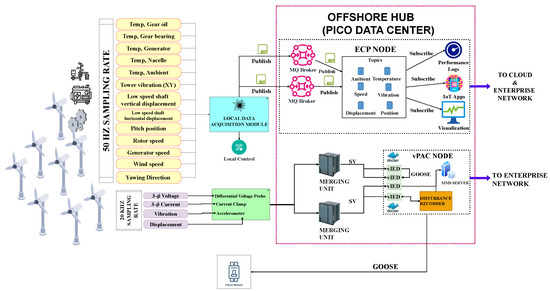 Figure 3 illustrates a data-acquisition system designed in the IIoT–Edge computing paradigm. In the figure, IIoT sensors are mounted to measure physical quantities on critical infrastructure. These IIoT devices collect highly granular data at different sampling rates. The data collected from the wind turbines is sent via sub-sea ethernet-based fiber optical cables to the offshore hub (set to house a pico data center (PDC)). A cluster of x86 servers, with diverse computing and memory capacities, are deployed within the PDC. Using the server cluster applications, these computing and memory resources are clustered in a unified server resource pool [32,59] and allocated to the Edge Computing Platform (ECP) node, virtual Protection, Automation, and Control (vPAC) node, and other IT/OT systems needed to facilitate wind farm operations.