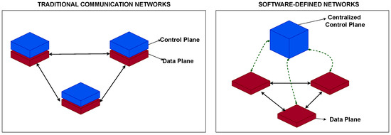 The term “Software-defined networking” was coined by Kate Green in MIT Technology Review in 2009 when describing the newly created OpenFlow specifications [72] as “a networking approach that utilizes software-based controllers or application programming interfaces (APIs) to manage hardware infrastructure and direct network traffic”. Other researchers have adopted the term to represent their ideas and work around OpenFlow [73,74,75]. Fundamentally, a software-defined network (SDN) decouples the control plane from the data plane, making the network devices (in the data plane) programmable through standardized application interfaces. It differs from traditional networks where the control and data planes are bundled in a single device.