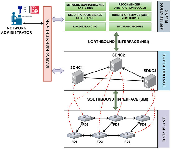 Application Plane: The application plane hosts Representational State Transfer (REST)-based network applications and services such as network monitoring and analytics, security and compliance, load balancing, and traffic engineering that monitor the network’s quality of service metrics [96,97]. The control plane’s controllers interact with these REST-based applications via the Northbound Interface (NBI) using the RESTCONF protocol [98,99]. Other techniques used at the NBI are RESTful APIs, OpenFlow v1.3-1.5, NETCONF, Google Remote Procedure Call (gRPC), and custom APIs and protocols.