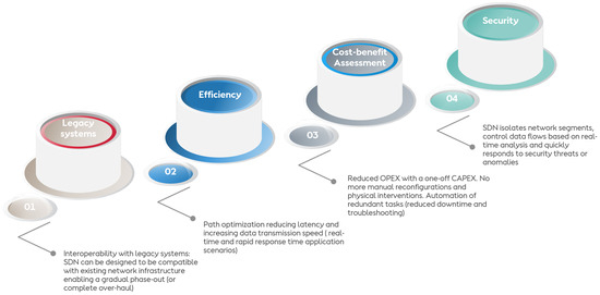 These SDN/NFV-based architectures are anticipated to be progressively integrated into industrial OT networks due to their multifaceted advantages summarized into four pillars (interoperability, efficiency, cost-benefit assessment, and security), as shown in Figure 7. These architectures demonstrate a robust capability for interoperability with legacy systems, ensuring seamless integration without necessitating extensive overhauls. This capability enables a gradual phase-out or complete overhaul of legacy systems without significant disruptions. However, the integration of SDN/NFV-based architectures can be challenging due to the legacy infrastructure commonly found in industrial environments, which may not be compatible with SDN protocols and architectures. Novel designs must ensure that the new SDN/NFV systems can seamlessly integrate with the existing network of 250 Ethernet switches and various NFV instances, thus maintaining continuity and operational efficiency.