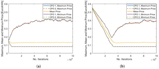 Price levels as a function of the number of iterations. (a) Initial number of chargers was set to one for CPO 1 and two for CPO 2. The initial price was was set to EUR 0.15/kWh over the whole day for both CPOs. (b) Initial number of chargers was set to 20 for CPO 1 and 25 for CPO 2. The initial price was was set to EUR 0.55/kWh over the whole day for both CPOs.