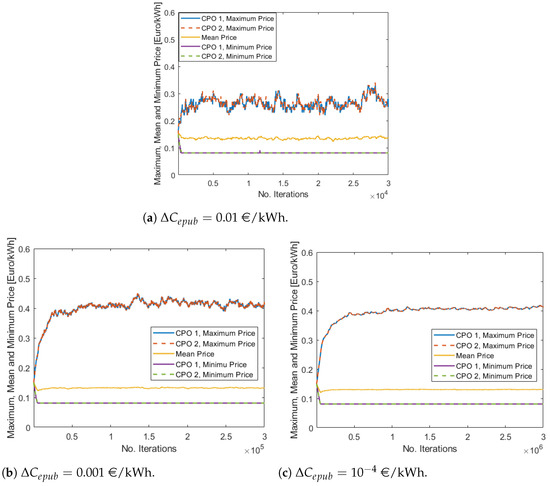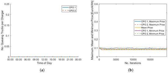 Now, it is investigated if the quasi-steady state is affected by the size of the parameter . The initial number of chargers was set to 12 for both CPOs, and the initial price for fast charging was set to EUR 0.15/kWh over the whole day for both CPOs. The price levels can be seen in Figure 6 when the value on is set according to the sub-captions in the figure. The number of iterations differs between the cases since a smaller value of requires more iterations to reach the quasi-steady state. The figure shows that the maximum price level becomes more stable with decreasing , while the lower price is unaffected. Also, one notices that the maximum price is significantly lower for when compared with and . One significant difference when comparing these three cases is that in the case with , the price difference of between the stations is high enough to make a truck prefer to queue instead of selecting the more expensive station, which puts a higher downward pressure on the prices. The conditions for this to happen are described in the following calculations.