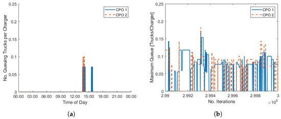 Assume that CPO 1 has a price higher than CPO 2; then, an arriving truck prefers to queue if the cost for queuing is less than the extra cost for charging, i.e., in Equation (12). Thus, the truck selects CPO 2 if