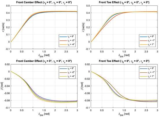 For the present investigation about the effect of suspension angles, only negative camber angles have been considered, meaning that the top part of the tire is more towards the vehicle centerline with respect to the bottom part. This is because this condition is the one improving the vehicle’s dynamic response thanks to a favorable condition of the outer wheel during a turn. Instead, for what concerns the toe angle, both positive and negative values are considered, with positive values meaning that the front part of the tire is more towards the vehicle centerline as compared to its rear part, which is typically known as toe-in condition. A steering pad constant speed maneuver at 90 km/h has been performed by increasing the steering wheel angle at a rate of one degree per second until reaching the vehicle handling limits for each of the available configurations of toe and camber angles at the front and rear suspensions. The effects of front suspension angles on vehicle response are reported in Figure 1 both in terms of yaw rate () and sideslip angle () responses to the steering wheel angle () input.
