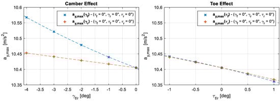 When inspecting the vehicle yaw rate response in Figure 1, it is possible to notice how a more negative camber angle is sharpening the transition between the linear and saturation regions, while also increasing the asymptotic value achieved for high steering wheel angle inputs. Still looking at the yaw rate response, but now as a function of the front toe angle, it is possible to notice how a toe-out () is deeply changing the slope of the linear region of the response, while also providing a smoother transition between the linear and the saturation regions. Instead, a toe-in () is generating an opposite trend but with a significantly lower variation with respect to the neutral toe () setting. For what concerns the vehicle sideslip angle response, which is fundamental for vehicle stability, it is possible to state that a more negative camber angle increases the limit value while also providing a faster transition to that value. A toe-in () lowers the sideslip angle limit value while providing a faster settling to that value, while a toe-out () is doing the opposite, thus increasing the limit value by a similar quantity and making the transition towards that value much smoother. The smooth variation of the vehicle sideslip angle is a desirable feature for ensuring vehicle stability and this is the reason why on standard road vehicles the front toe is slightly negative and the rear toe slightly positive. In addition to the pure vehicle cornering response variation as a function of suspension angles presented in Figure 1, it is also possible to inspect the effects these angles have on the maximum achievable lateral acceleration (), as reported in Figure 2. It is noteworthy to say that, in steady-state conditions and at a constant traveling speed (), the lateral acceleration is proportional to the yaw rate ().