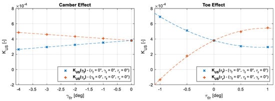 When analyzing Figure 2, it is evident that a more negative camber angle both at the front and at the rear tires is able to improve the maximum achievable lateral acceleration. For this reason, it would be completely out of sense to impose positive camber angles. Moreover, for the specific vehicle considered in this paper, the front camber angle is much more effective than the rear camber angle in increasing the maximum achievable vehicle lateral acceleration. In a similar way, a more negative toe angle also increases the maximum achievable vehicle lateral acceleration with similar effects if considering toe angle variations at the front or rear tires. The capability to increase the maximum lateral acceleration is for sure beneficial for improving vehicle cornering; nevertheless, this is not the only aspect to investigate. Indeed, the vehicle responsiveness to the steering input is also a fundamental aspect for improving vehicle cornering, which is represented by the understeering coefficient (). In particular, a smaller understeering coefficient means a prompter vehicle response, which is given by an increased slope of the yaw rate linear response region as a function of the steering wheel angle input. The understeering coefficient variation as a function of both front and rear suspension angles during the steering pad constant speed maneuver is reported in Figure 3.