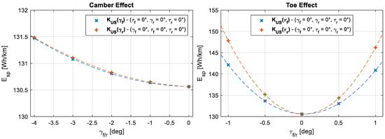 The results in Figure 3 highlight that a more negative camber at the front or rear suspensions generates an opposite variation of the understeering coefficient, which is almost linear for the inspected range of camber angles. In particular, the decrease in the understeering coefficient caused by a negative camber angle at the front tires is slightly bigger than the increase in the understeering coefficient caused by the same negative camber angle at the rear tires. This means that by imposing the same negative camber angle at both front and rear tires, the vehicle becomes slightly less understeering, while also being able to achieve a higher lateral acceleration limit, according to the results in Figure 2. Still analyzing Figure 3, it is possible to notice that the same variation of toe angle at the front or rear suspensions is also generating an opposite variation of the understeering coefficient. In this case, the rear toe variation affects the understeering coefficient more than the front toe variation, up to a point where an excessive toe-out () at the rear is causing the vehicle to become oversteering (). As a result of this analysis of the effect of suspension angles on vehicle cornering performance, it is evident that a proper suspension setup can deeply modify vehicle handling properties when moving from almost neutral angle setups to aggressive setups. Nevertheless, this comes at the cost of increased tire wear due to the modification of the contact patch and the increased tire scrubbing over the ground. Together with increased tire consumption, energy losses are also expected to increase because of a change in suspension angles from their neutral position. For this reason, a sweep of 90 km/h constant-speed straight-runs varying toe and camber angles both at the front and rear suspensions has been simulated with the same vehicle model used for cornering analysis. The outcome of these simulations in terms of specific energy consumption () is reported in Figure 4.