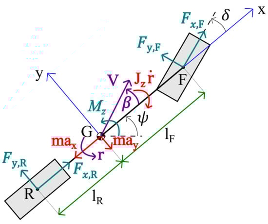 The torque vectoring controller designed in this paper is to be applied on the vehicle featuring the baseline suspension setup with the objective of reproducing the cornering capabilities of the same vehicle when featuring the sporty suspension setup. For this purpose, the single-track vehicle model represented in Figure 5 is adopted for a proper torque vectoring controller design. In particular, the linearized equations of motion of the single-track vehicle model at constant speed [] are considered