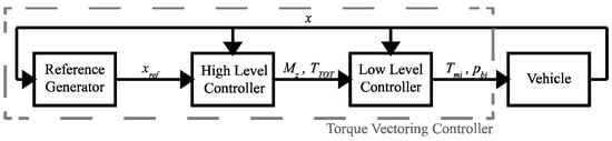 The torque vectoring control architecture proposed in this paper is a multilayer cascaded control composed of three main blocks: the reference generator, the high-level controller and the low-level controller, as reported in Figure 6. The reference generator obtains driver inputs and vehicle states () to generate a reference () for the vehicle lateral dynamics. Then, the high-level controller takes as input the driver commands, the vehicle states, and the output quantities from the reference generator to define the total driving torque () and yaw moment () to be applied to the vehicle. In the end, the low-level controller takes the total driving torque and yaw moment demand as inputs to define a torque demand for each motor () and, if necessary, a braking pressure for each brake caliper (). All these three components of the torque vectoring control are designed for the present study and are thus described in detail in the following paragraphs.