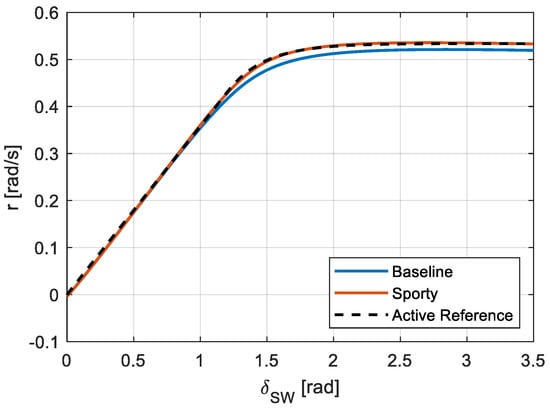 where and are the slope of the linear yaw rate response region for the baseline and the sporty vehicles, respectively. The feedback control gains () are instead tuned with a model-based approach based on the Maclaurin series expansion [], with the objective of obtaining a robust and stable controlled system that performs as closely as possible to the sporty vehicle.