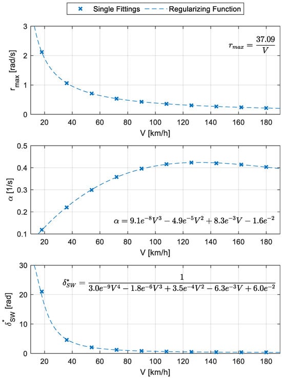 From the results in Figure 7, it is evident how the sporty suspension setup can achieve a higher yaw rate limit value as compared to the baseline suspension setup. Moreover, the sporty vehicle also shows a slightly increased slope of the linear response region, together with a slightly sharper transition towards the yaw rate saturation region, as compared to the baseline vehicle. For what concerns the yaw rate reference for the active vehicle, it is instead possible to appreciate how it closely tracks the response of the vehicle equipped with the sporty suspension setup. Nevertheless, the yaw rate reference should be computed for any vehicle speed, including those in between the currently tested values, of which the results in Figure 7 are just an example. This is the reason why the reference function characteristic coefficients (, , ) are regularized through a proper fitting, as shown in Figure 8. In particular, Figure 8 reports the coefficient values for each single fitting together with the line representation and the mathematical expression of the regularizing function. In there, it can be appreciated how both the maximum attainable yaw rate () and the steering wheel angle () at which there is the transition between linear and saturation regions of the yaw rate response, are decreasing more than linearly with increasing vehicle speed. Conversely, the slope () of the linear region of the yaw rate response has a non-monotonic trend, with a maximum at approximately 130 km/h.