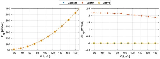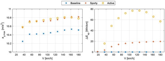 From Figure 9, it is possible to appreciate how the specific energy consumption () increases more than linearly with vehicle speed because of the aerodynamic resistance, while apparently not showing significant differences for the three inspected vehicle configurations. Nevertheless, by looking at the variation of the specific energy consumption () with respect to the baseline vehicle, it can be noticed how the sporty vehicle requires more energy than the baseline vehicle to maintain a constant speed in a straight line, with this variation reducing going towards high speeds. This phenomenon could be explained by considering that, for an increasing vehicle speed, the lateral slip velocity generating power losses at the tire-ground contact tends to decrease. Instead, the active vehicle shows the same energy consumption as the baseline vehicle when in a straight line because its torque vectoring capabilities are not used in straight running.