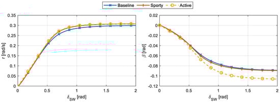 Analyzing the results in Figure 10, it is evident how the active vehicle featuring torque vectoring capabilities is able to track the yaw rate reference aiming at reproducing the sporty vehicle configuration. Indeed, the active and the sporty vehicle yaw rate responses match, and they both show an improvement in vehicle cornering response. The yaw rate response improvement of the active vehicle with respect to the baseline vehicle is obtained thanks to the torque vectoring capabilities of the active vehicle, but this improvement comes at the expense of having a higher sideslip angle. Indeed, the sideslip angle is pretty similar for the baseline and the sporty vehicle configurations, while it shows a steeper variation with the input steering wheel angle and settles at a higher value for the active vehicle configuration.