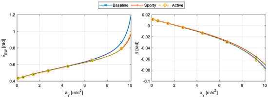 The results in Figure 12, representing the trend of the steering wheel angle as a function of the vehicle lateral acceleration, are again showing an almost equivalent cornering performance of the sporty and active vehicle configurations, which are superior to the baseline one. Indeed, the baseline vehicle requires a higher steering wheel angle input to perform a turn having the same radius of curvature. Moreover, if analyzing the sideslip angle, it is possible to notice how the baseline and the active vehicle configurations exhibit the same response, while the sporty vehicle is also capable of reducing the sideslip angle. This phenomenon can be attributed to the suspension angle configurations, especially regarding the toe angle.