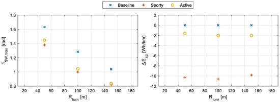 The results in Figure 13 about the maximum steering wheel angle commanded for successfully completing the maneuver suggest that the active vehicle is slightly more demanding than the sporty one, while the baseline vehicle is significantly more demanding than both the other configurations in terms of steering input requirements. Instead, for what concerns the variation of specific energy consumption for the sporty and active vehicle configurations with respect to the baseline one in Figure 13, it is possible to notice how both the sporty and the active vehicle configurations require lower energy than the baseline one for running a constant radius turn. In particular, the energy savings of the sporty vehicle are almost five times those achieved with the active vehicle. This is mainly due to a lower longitudinal slip of the outer tires of the sporty vehicle as compared to those obtained with the active vehicle, which increases the longitudinal forces at the outer wheels of the turn to improve the vehicle cornering response. Moreover, the lower input steering angle required by the sporty vehicle as compared to the active one reduces the tire slip angles and thus the power losses due to the lateral slip speed at the tire-ground contact.