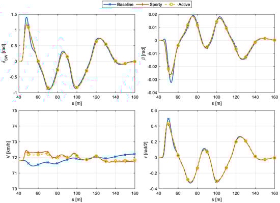 Upon examining the results in Figure 14, it is evident that the sporty and the active vehicle configurations are closely performing even in transient conditions, meaning a proper design and tuning of the torque vectoring controller. Moreover, the trends identified with the steady-state tests are confirmed. Indeed, the sporty and active vehicles are in general able to enhance the vehicle cornering performance, with the active vehicle requiring a slightly larger steering wheel angle input and showing a slightly higher sideslip angle as compared to the sporty vehicle. For what concerns power consumption, the baseline vehicle is the most requiring ( Wh/km), with then the active vehicle ( Wh/km), which, in this case, is just slightly more energy-consuming than the sporty one ( Wh/km).