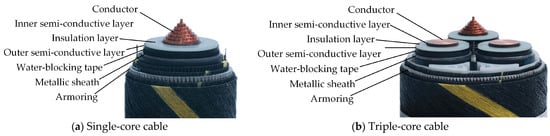 The choice of cable laying method is closely related to the laying length and environment, as well as the cable material and structure. Figure 1a depicts a typical single-core cable, characterized by its simple structure, ease of maintenance, and efficient heat dissipation. They are commonly used in high-voltage applications exceeding 110 kV, as they can effectively withstand high voltages without generating excessive electromagnetic interference. Additionally, there are also multi-core cables, such as triple-core cables, as illustrated in Figure 1b, particularly in three-phase electrical systems. Each core in these cables independently conducts one phase of current, enhancing spatial efficiency and potentially reducing costs. Triple-core cables, often shielded with armored steel strips, exhibit a degree of leniency in their laying environments and provide a protective barrier against general external forces []. However, they are susceptible to inter-phase short circuits if the insulating materials become damp or deteriorate. Conversely, single-core cables, typically spaced farther apart, predominantly experience grounding short circuits under similar conditions of insulation degradation, with inter-phase short circuits being a rare occurrence. Additionally, single-core cables require a more stringent laying environment due to the absence of magnetic steel strips.