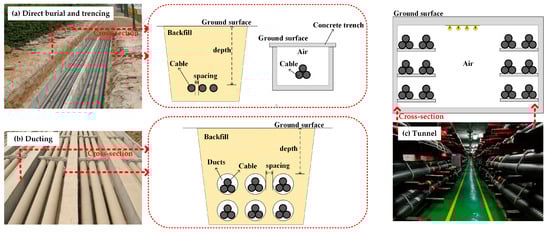 The first underground cables were laid in the latter part of the 19th century []. Installing underground cables is a complex and time-consuming process with specialized equipment, including trenching, laying the cables, and backfilling the trenches. According to different environmental conditions, ampacity requirements, and maintenance needs, the following are the main laying methods, which are also presented in Figure 2: