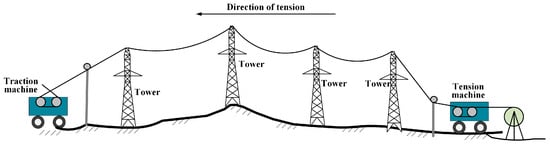 The installation of overhead lines involves erecting support structures, stringing power conductors, and connecting necessary accessories [], which is less complex compared to underground cable laying. In the installation process of high-voltage and ultra-high-voltage cables, tension stringing and tensioning are the most common methods. The diagram of the tension-stringing method is demonstrated in Figure 3. Tension stringing machines, which are highly automated, enhance construction efficiency and conserve labor and resources. The process of tension stringing involves the use of unmanned aerial vehicles or manual methods to thread a pulling rope through transmission towers and grounding pulleys. Subsequently, a tensioning device retracts the pulling rope, which in turn pulls the cable to complete its installation. During the installation process, the cable does not come into contact with the ground, preventing abrasion and damage to the outer sheath of the cable.