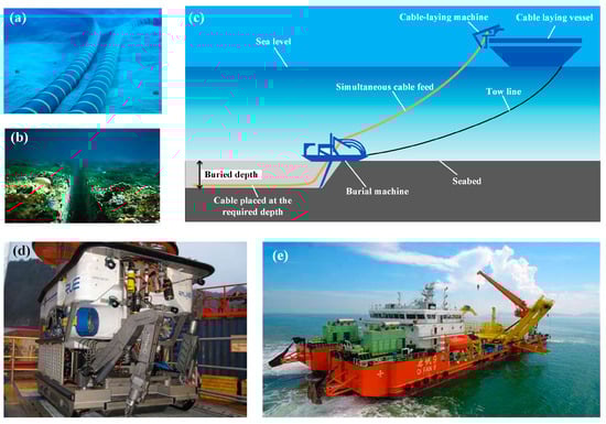 Figure 4. (a) The submarine cable is directly placed at the seabed surface, namely the surface laying []. (b) The trench used for the buried laying []. (c) The simultaneous laying and burying []. (d) The ROV []. (e) The “Qifan 9” CLV. - Buried laying: The cable is buried at a certain depth beneath the seabed by using underwater trenching machines or water jet trenching technology, as shown in Figure 4b []. This method effectively protects the cable from physical damage and external disturbances (such as tides and ocean currents), making it suitable for areas with heavy traffic or frequent seabed activity. However, this method brings great difficulties to the maintenance, fault finding, and accurate positioning of cables.