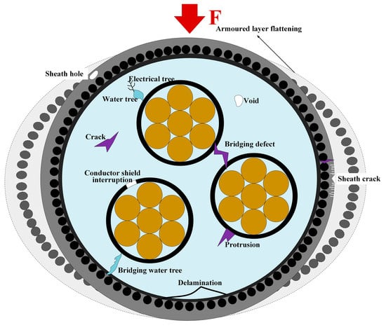 From the innermost to the outermost components of the coaxial cable, they are the conductor, inner semiconductive layer, insulation layer, outer semiconductive layer, water-blocking tape, metallic sheath, armoring, and other serving layers. Among them, the conductor, insulation layer, metallic sheath, and armoring are the most closely related to the laying environment and process. The core conductor, which carries the current, is commonly made from copper or aluminum []. Copper-core cables are preferred for their higher current-carrying capacity, lower voltage loss, and resistance to oxidation and corrosion. The metallic sheath layer can prevent the insulation from coming into contact with moisture, which can lead to the formation of water trees [], and it also acts as a pathway for zero-sequence fault currents in the event of a fault. The sheath grounding methods mainly include single-ended earthing, neutral point earthing, double-ended earthing, and cross-bonded earthing []. The choice of grounding method depends on factors such as voltage level, cable length, and environmental conditions. Single-ended earthing is suitable for shorter, single-core underground cables and can reduce circulating currents. Double-ended earthing is used for three-core cables or long-distance submarine cables, where direct grounding should be performed at both ends of the line. If there are intermediate joints, these should also be directly grounded, which is known as neutral point earthing. The cross-bonding grounding method is used for long-distance cables, where insulated joints should be used to divide the metal sheath and insulation shield into three segments or multiples of three to reduce induced voltage and circulating currents. Cross-linked polyethylene (XLPE) is widely employed as an insulation layer due to its excellent current-carrying capacity, mechanical strength, corrosion resistance, thermal aging resistance, and ease of laying []. Furthermore, thermoplastic materials such as polypropylene (PP) [] are anticipated to facilitate the self-healing of defects and self-restoration of insulation properties while maintaining superior electrical insulation and thermal resistance, marking a significant direction for the future development of insulation materials. Improper cable installation can cause various faults and safety hazards, leading to failures in the insulating and mechanical properties of the cable, as well as short circuits and even electrical breakdown.