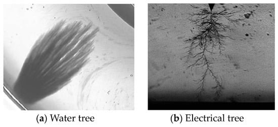 The structure of water trees or electrical trees typically exhibits a tree- or bush-like pattern within the XLPE insulation, as illustrated in Figure 6, impacting the long-term insulating properties of the cable. Identification and location can often be addressed through effective monitoring methods [] due to their lengthy incubation periods. Nonetheless, current online detection and fault location techniques require further enhancement to address these faults, particularly in complex laying environments where the fault process is both difficult and costly.