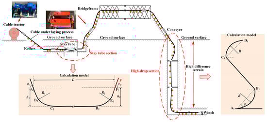 A cable laying under a complex environment [] is illustrated in Figure 7. The whole laying path includes cable interlayers, cable trenches, row tubers, stay tube sections, and high-drop sections. Among them, the main difficulties in laying are stay tube sections and high-drop sections. The simplified ideal model for traction force calculation in stay tube section and high-drop section is demonstrated in Figure 7, where L is the horizontal distance of the cable laying in stay tube section; θ1 and θ2 are the incident angle and the exit angle of the cable laying in stay tube section, respectively; h1 and h2 are the depth of the incident end and the depth of the exit end of the cable laying in stay tube section; R1, R2, and R are the radius corresponding to the arc. The cable has different bending states along the entire path, causing differences in the traction force on the cable. The traction calculation model during cable laying is given in Table 3 [], where L is the laying horizontal distance, W is the weight of the unit length of the cable, and μ is the coefficient of friction.