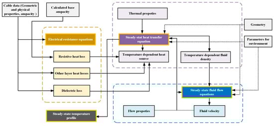 The thermal resistance and ampacity changes to the cable need to be considered during laying. The thermal conductivities and diffusivities of the seabed and its ambient temperature, as well as the laying depths, may vary along the route []. This may be a result of natural route conditions or a possible settlement of the cable into soft sediment, as well as silting and sediment deposition. Both may result in much greater soil coverage than the design value, thus leading to unacceptable rises in cable temperatures. In addition, the ocean current will also affect the temperature distribution and current carrying capacity of the cable in the form of convection heat transfer [,,]. A calculation model combining heat transfer with thermo-electric effects and ocean current is illustrated in Figure 8 []. Therefore, when calculating heat flux and current carrying capacity, the influence of heat convection and heat transfer must be considered.