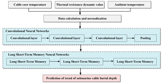 Cao et al. [] investigated the cable conductor and its surrounding temperature in multi-layered sediment, where the burial depth and soil permeability have a significant impact on the temperature distribution. Li et al. [] proposed a method to predict the change in submarine cable burial depth based on convolutional neural networks and long short-term memory units. As shown in Figure 9, the change in submarine cable burial depth is predicted based on the thermal path model. The experimental verification was further conducted for the proposed algorithm. Accurate prediction of the burial depth is helpful for later calculations of thermal resistance and ampacity. These studies provide crucial insights into the physical factors influencing cable performance and offer practical tools for predicting changes that affect cable reliability and efficiency. However, the universality of the models remains to be validated, as does the potential impact of geological variations on temperature across different regions. Furthermore, advanced machine learning methods rely heavily on large volumes of data and high-quality data inputs, where data acquisition and processing can pose challenges.