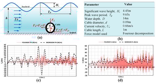 The force analysis of surface laying submarine cable []; (a) the schematic diagram of hydrodynamic forces, where Fd is the drag force, Fi is the inertia force, Fh is the total horizontal force, and Ws is the gravity of the cable; (b) the parameter setup in the calculation model; (c,d) and the horizontal and vertical forces, respectively [].