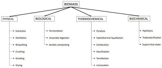 There are multiple methods for converting biomass into biofuel; these methods are illustrated in Figure 1, divided by the kind of process involved in the conversion. This work [] presents different technologies focusing on the product’s characteristics, together with a quick overview of the primary advantages and drawbacks. Physical biomass conversion involves modifying biomass by preprocessing activities, size reduction, drying, and densification. This method converts biomass into forms with improved characteristics, including increased mass and energy density, and hydrophobicity compared to raw biomass. The primary benefits of this process are its simplicity and the absence of chemicals, while the main drawback is the high energy requirement, which often makes it economically unsustainable []. These processes often utilize microbial systems to improve the conversion of specific chemical products by triggering a series of reactions in a metabolic pathway. Biological conversion techniques are considered environmentally friendly and cost-effective because they operate under ambient temperature and pressure conditions and allow for the use of many types of biomass. The main drawbacks include the extended duration of the conversion, which can take weeks to complete, and the mandatory separation phase at the end [].