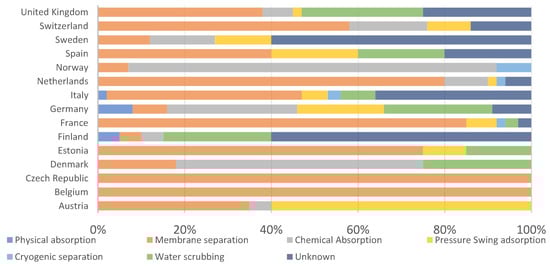 After generation, the biogas can be used directly in a combined heat and power system (CHP), or it can be upgraded into biomethane. The direct burning of biogas in the CHP system offers better environmental performance than an upgrading system []. Producing biomethane enables its injection into the natural gas grid for use in energy production or challenging areas like transport and buildings, as shown in Figure 2, resulting in reduced greenhouse gas emissions and the potential substitution of natural gas []. Different methods can be used to produce biomethane from biogas. Well-known technologies include water scrubbing (WS), chemical absorption (CA), organic scrubbing (OS), membrane separations (MS), and pressure swing adsorption (PSA). Cryogenic distillation (CD) is being considered as a potential alternative method to produce liquefied biomethane (LBM) and LCO2 as a byproduct in the future. Other methods are also being studied at a laboratory scale and are demonstrating promising results as biological upgrades. The selection of a technology depends on factors such as the composition of the incoming biogas, the system’s size, and the desired methane purity. Figure 3 illustrates the diffusion of the different upgrading technology in Europe, and it highlights that membrane separation is the predominant one.