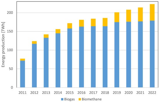 The biogas and biomethane business has been undergoing significant expansion in recent years due to substantial investments and favorable policies [,]. In 2022, biogas output reached 179 TWh, in accordance with rge EBA report [], and biomethane production was 44 TWh, showing a 16% growth from 2021, as shown in Figure 4. The process of converting biogas into biomethane requires an initial cleaning step to exclude hydrogen sulfide, volatile organic compounds, and occasionally water. The presence of this biogas cleaning is related to the selection of the following upgrading technology.