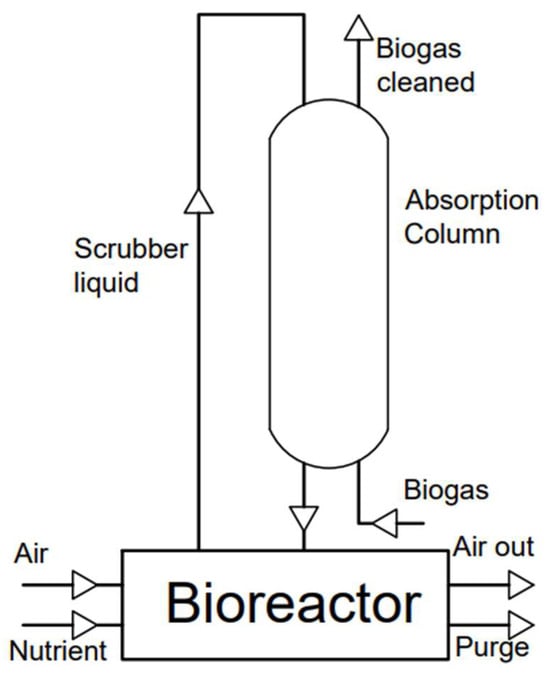 A bioscrubber (BS) is composed of two main components: an absorption tower that absorbs pollutants like H2S in water, and a bioreactor unit where microorganisms transform the pollutants into end products []. Bioscrubbers can also be adapted to remove mixed pollutants by adjusting the reactor’s design. This solution is highly effective in removing water-soluble contaminants and has the ability to operate throughout a broad spectrum of biogas compositions and perform an adequate cleaning process. BSs require a lot of maintenance and protective measures for dealing with secondary contamination from the liquid waste stream, and are operationally complex due to their biological nature []. Veolia and Paques are some noteworthy producers [,].