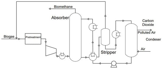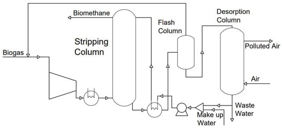 where Qbiogas is the total biogas flow, %CO2 is the molar percentage of carbon dioxide in the raw biogas, PCO2 is the partial pressure of carbon dioxide in the absorption column, and KH is Henry’s constant. To upgrade 1000 Nm3/h of raw biogas, a water flow rate of 180 to 200 m3/h is typically required, depending on the pressure and water temperature. The consumption cost can be divided as follows: 0.10–0.15 kWh/Nm3 for biogas compression, 0.05–0.10 kWh/Nm3 for water pumping, and 0.01–0.05 kWh/Nm3 for biogas cooling after compression []. The achievable methane purity is approximately 97% with a methane recovery rate of about 98% []. The purity of biogas is significantly affected by the presence of oxygen and nitrogen, as most of them are extracted together with the biomethane stream.