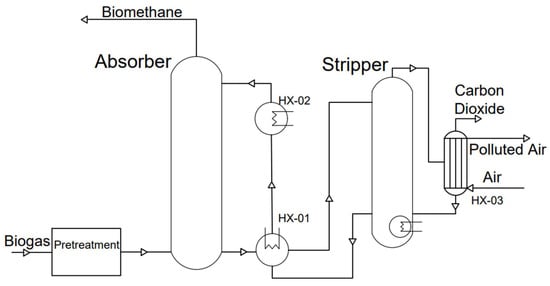 Amine scrubbing is the primary method for upgrading through absorption, involving a reagent that forms chemical bonds with CO2 molecules. Producing stable molecules by reacting carbon dioxide with amine compounds is crucial for effective CO2 removal. The most commonly utilized amines in chemical absorption upgrading systems are MEA, MDEA, DEA, and DGA []. Based on these results [], the most cost-effective and energy-efficient approach is DGA. Biogas pretreatment to remove H2S is crucial to prevent the degradation of amine, which can lead to economic and environmental damage. Following that, the biogas is compressed to reach the operational pressure of the absorber at around 2 bar []. The pressurized stream enters the column from the bottom and interacts with the amine solution. An exothermic reaction takes place within the absorber, increasing the temperature of the solution. Absorption is thermodynamically favored at low temperatures but kinetically favored at higher temperatures []. So, an equilibrium must be achieved between the reaction time, which affects the column dimension, and the reaction efficiency. The temperature, a crucial operational factor, varies between 20 °C and 65 °C, depending on the type of amine chosen []. The gas exiting the first column is mostly methane, while the liquid product from the lower section, primarily consisting of amine and CO2, requires regeneration to recover the amine solution. The liquid stream enters HX-01, as shown in Figure 9, where it is preheated by the regenerated solution. The ammine–CO2 solution is then heated in the desorption column with a reboiler. The solution partially evaporates and leaves the top of the column to be cooled down in HX-03. Both columns are usually filled with packing materials to maximize the exchange area. Due to the high pH of the solution caused by the basic amines, the possibility of bacteria development on the packing material is minimal. The last step of the process is devoted to the amine condensing and separation from the CO2, which is subsequently released into the atmosphere. The regenerated amine solution from the bottom of the desorption column is cooled using heat exchangers HX-01 and HX-02 before entering the absorber column.